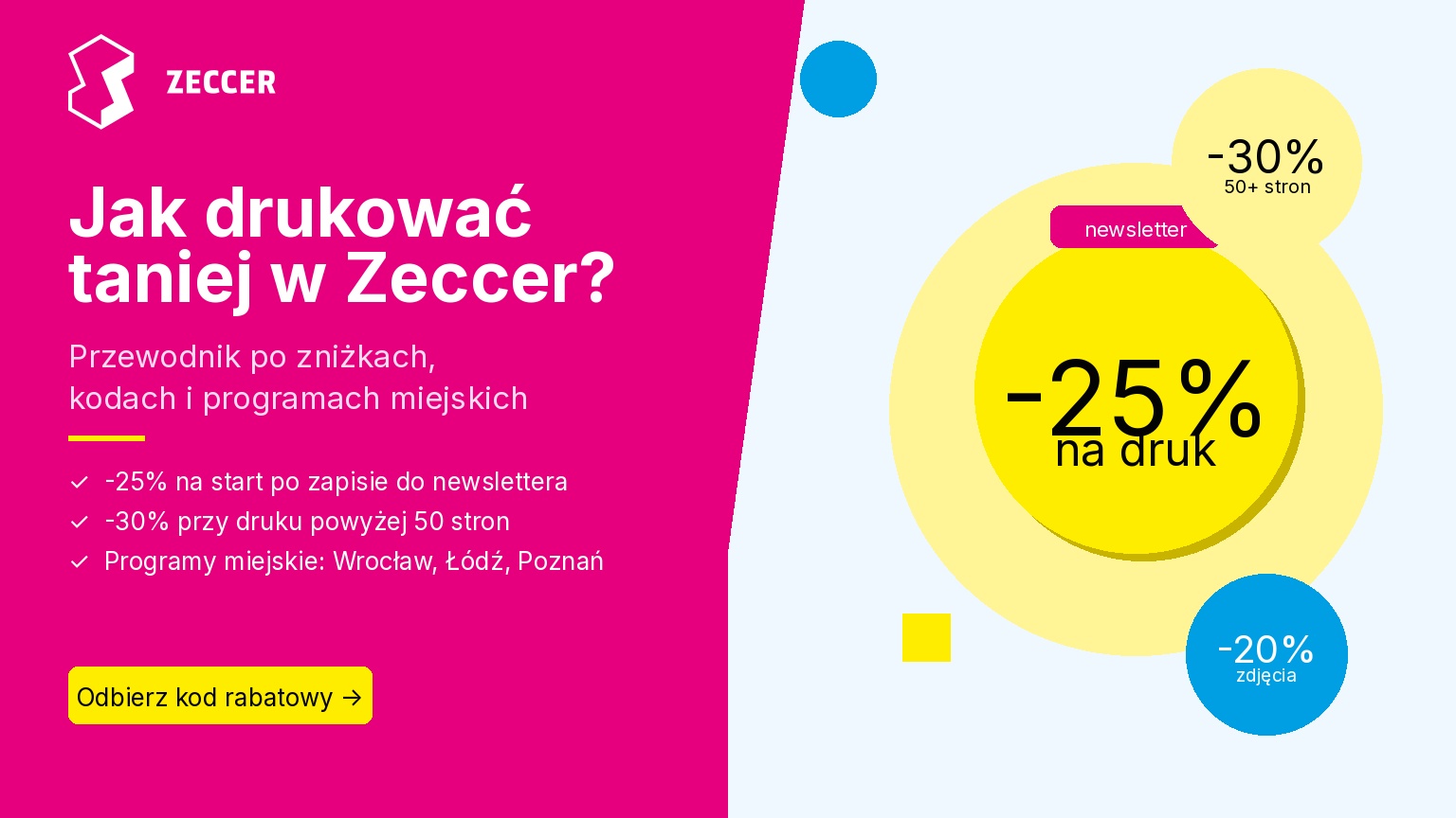 Każdy nowy subskrybent naszego newslettera otrzymuje na start jednorazowy kod rabatowy obniżający koszt druku o 25%. Kod trafia bezpośrednio na Twoją skrzynkę e-mail i możesz go wykorzystać w dowolnym punkcie druku Zeccer – niezależnie od tego, czy drukujesz w Żabce, na stacji Moya, czy w galerii handlowej.